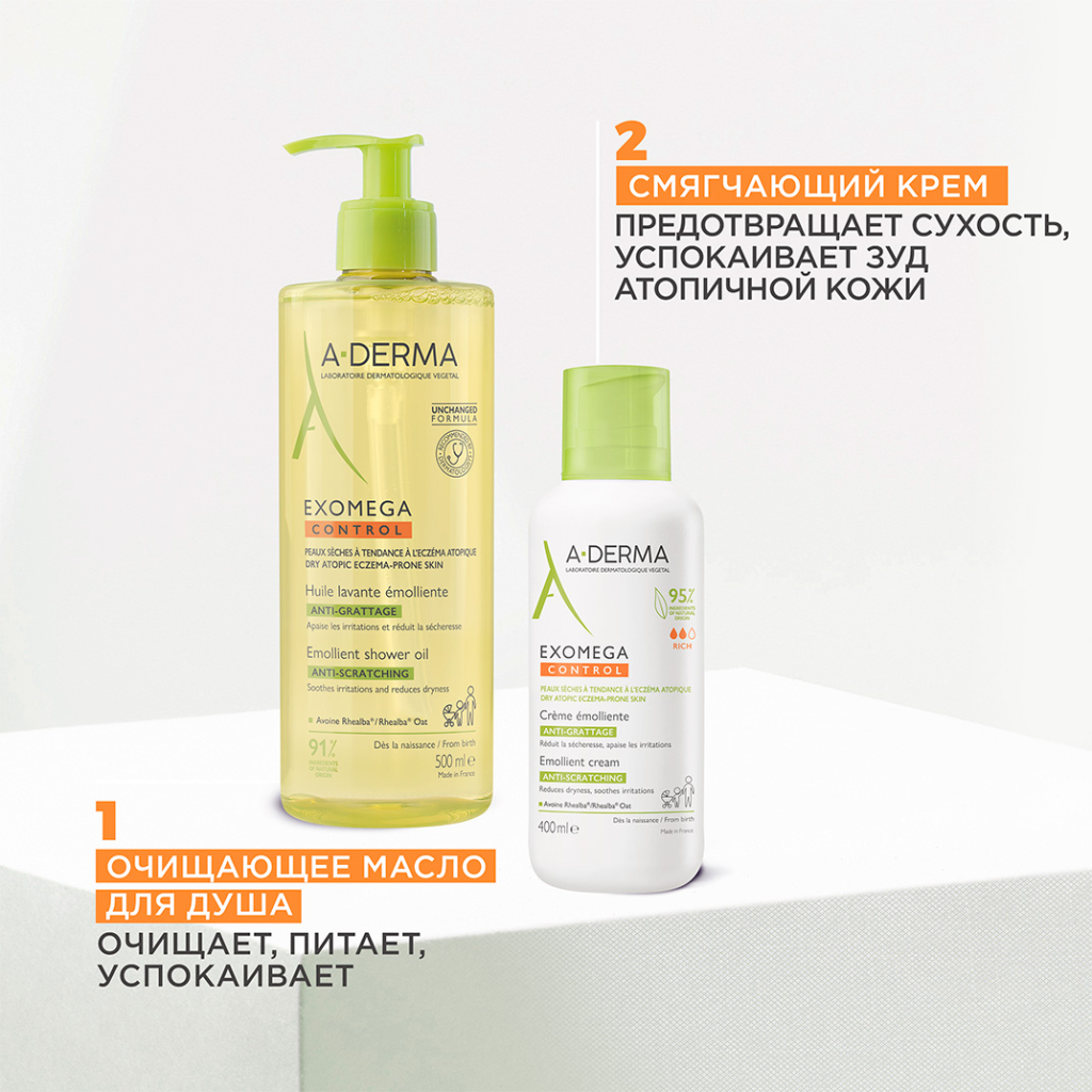 Крем-эмолент A-DERMA EXOMEGA CONTROL мгновенно смягчает и успокаивает сухую, атопичную кожу, снижает сухость, зуд и покраснение. Укрепляет защитный липидный барьер и балансирует микробиом кожи. Содержит формулу на основе органического экстракта ростков овса Реальба, состоящую из 95% ингредиентов натурального происхождения.
