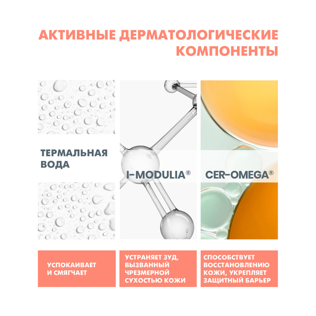 • Успокаивающий эффект: благодаря I-modulia® — активному компоненту, разработанному на основе биотехнологий, крем снижает зуд и раздражение, вызванные сухостью и атопией.