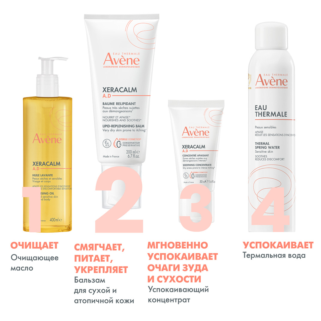 AVENE XeraCalm A.D Крем действует на несколько ключевых аспектов кожных проблем: