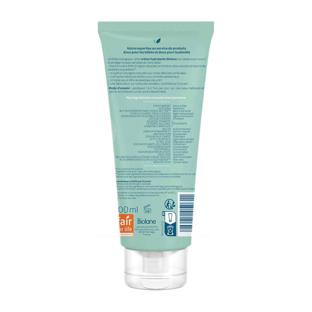 Органический увлажняющий крем Biolane для лица и тела создан для питания и защиты чувствительной кожи младенцев. Его формула объединяет глубокое увлажнение и отличную переносимость, содержит органическое алоэ вера и органическое масло ши — ингредиенты, соответствующие принципам справедливой торговли (стандарт Fair for Life). Они способствуют восстановлению кожи, снимают покраснения и раздражения. Продукт протестирован под наблюдением педиатров, уменьшает потерю влаги и обеспечивает интенсивное питание. Нежный аромат с нотами фиалки на 100% натуральный.