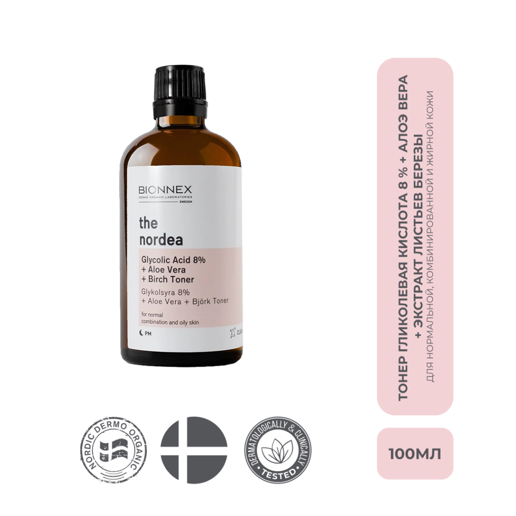 Купить Bionnex THE NORDEA Тонер Гликолевая кислота 8 % + Алоэ вера + Экстракт листьев березы для нормальной, комбинированной и жирной кожи 100 мл