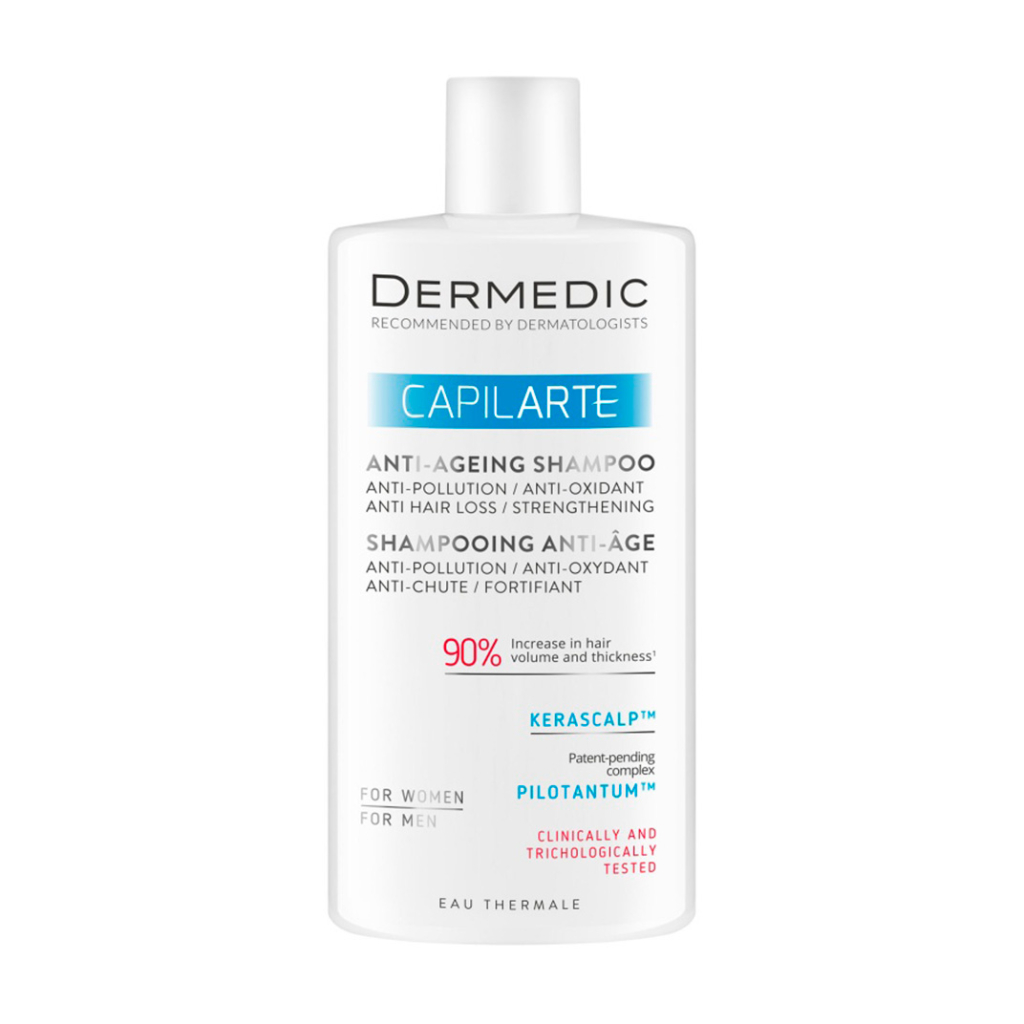 Шампунь Dermedic Capilarte Anti-Ageing разработан для комплексной борьбы с возрастными изменениями волос и кожи головы. Активные компоненты, включая кофеин, экстракт яблока Malus domestica, базилика и специализированные комплексы Kerascalp и Pilotantum, направлены на замедление старения фолликулов, предотвращение выпадения и восстановление жизненной силы волос. Подходит для различных видов алопеции и ослабленных волос.