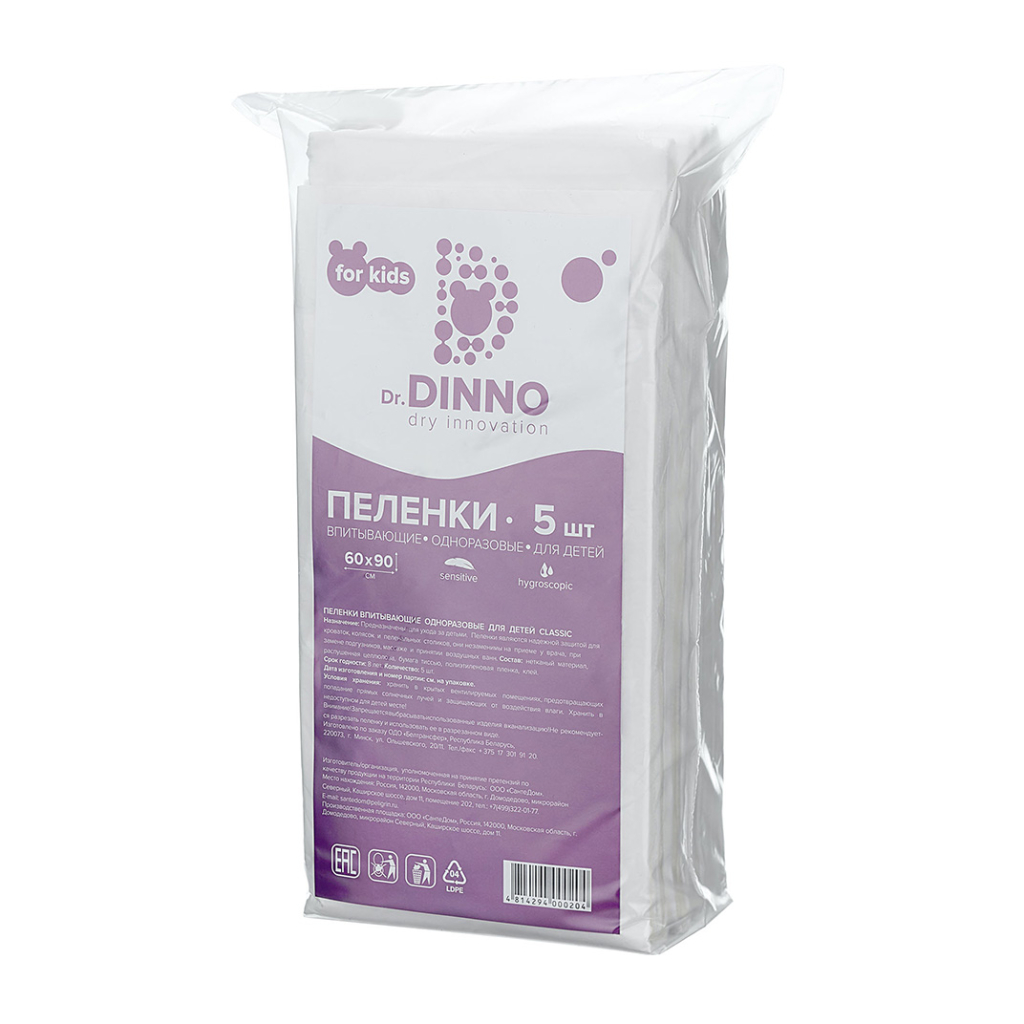 Dr.Dinno Пелёнки впитывающие одноразовые для детей 60х90, 5 шт