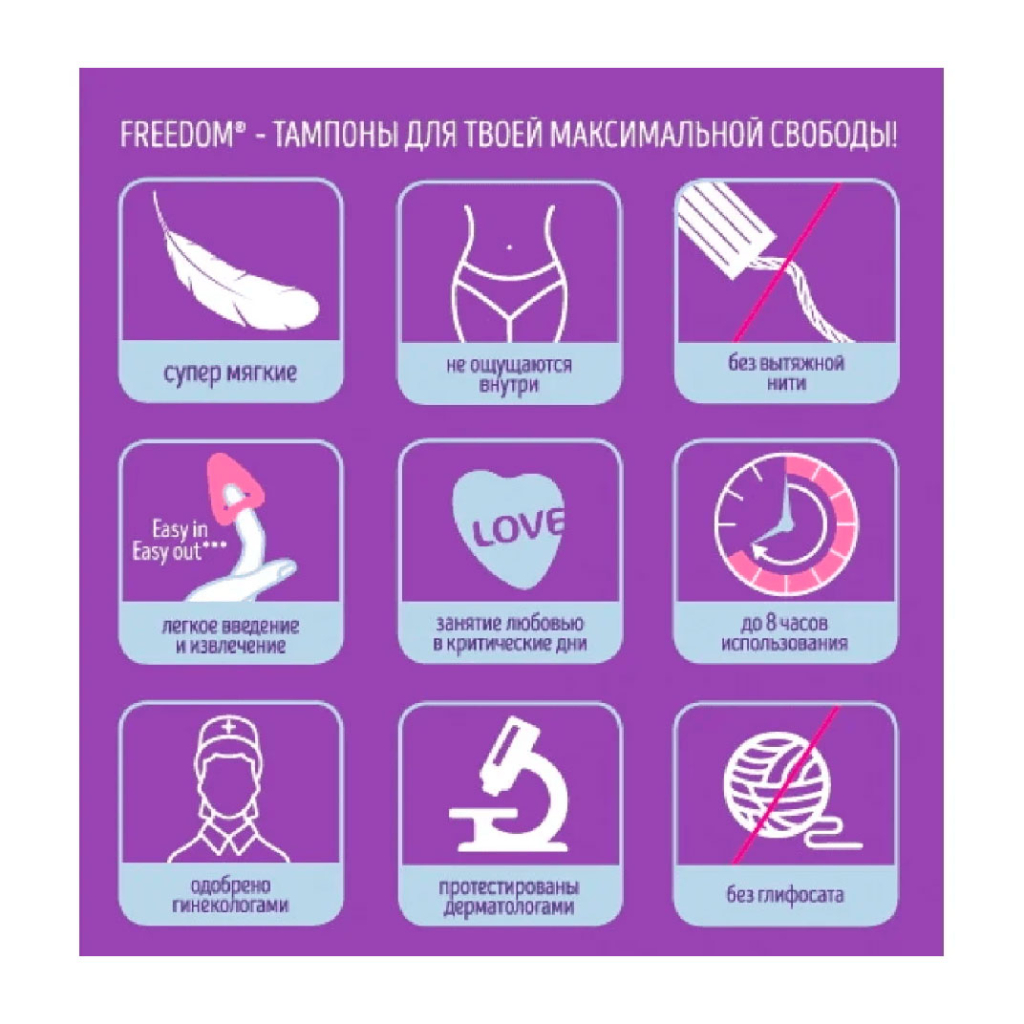 FREEDOM® — инновационные тампоны, разработанные для активных женщин. Их анатомическая форма в виде сердечка и воздушный материал обеспечивают лёгкость введения, комфортное ношение и удобное извлечение. Тампоны идеально адаптируются под форму тела и не ощущаются внутри. Продукт одобрен гинекологами, прошёл дерматологическое тестирование и подходит для средних и обильных выделений.