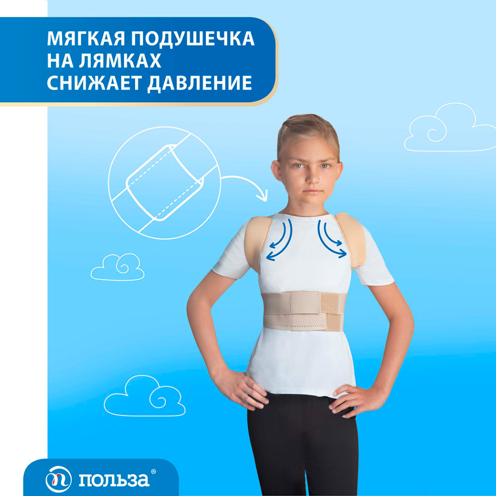 - Создает мягкую реклинацию с отведением плечевого пояса кзади и разгрузку грудного отдела позвоночника, не нарушая нормального мышечного тонуса.