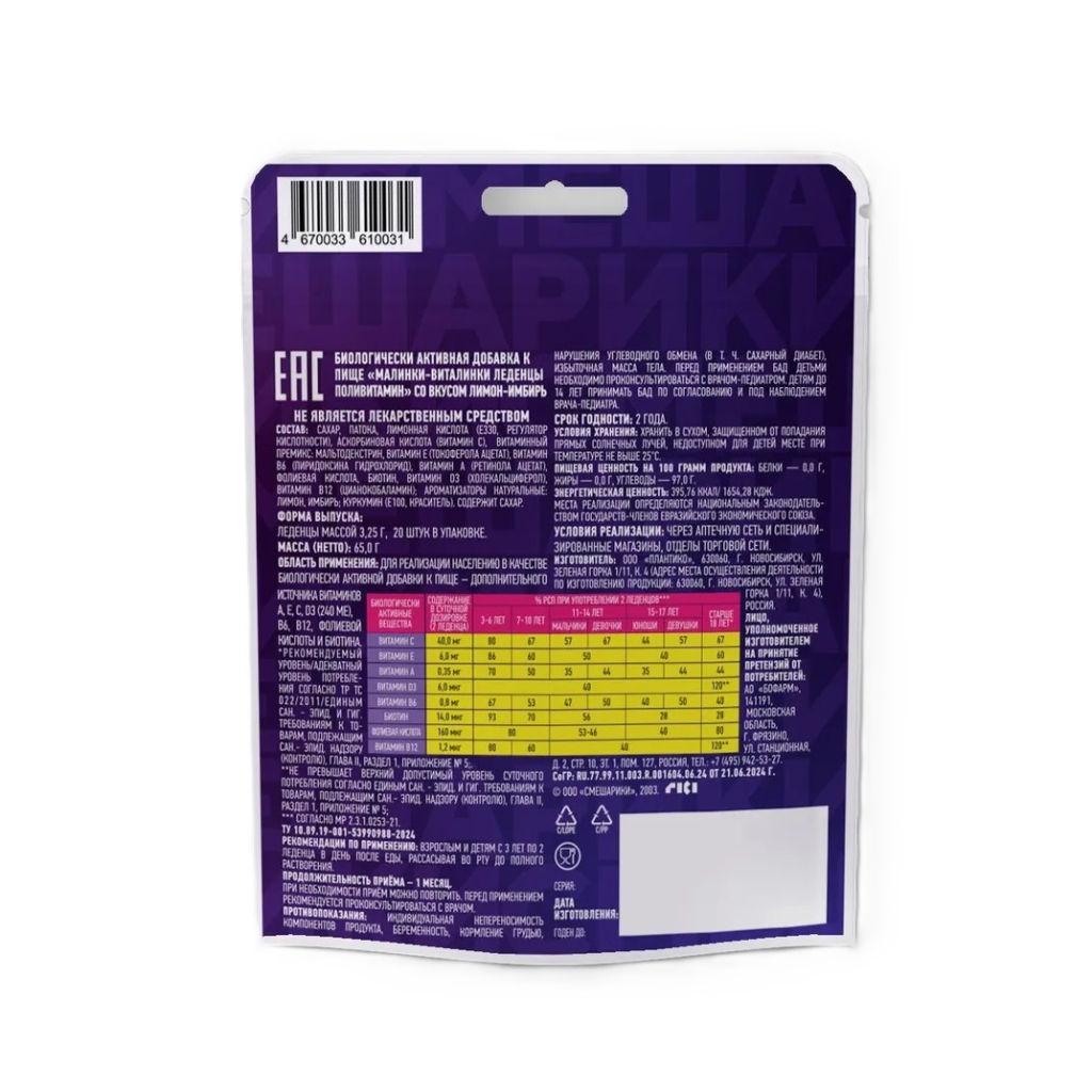 Инструкция по применению для Малинки-Виталинки леденцы поливитамин №20 со вкусом лимон-имбирь