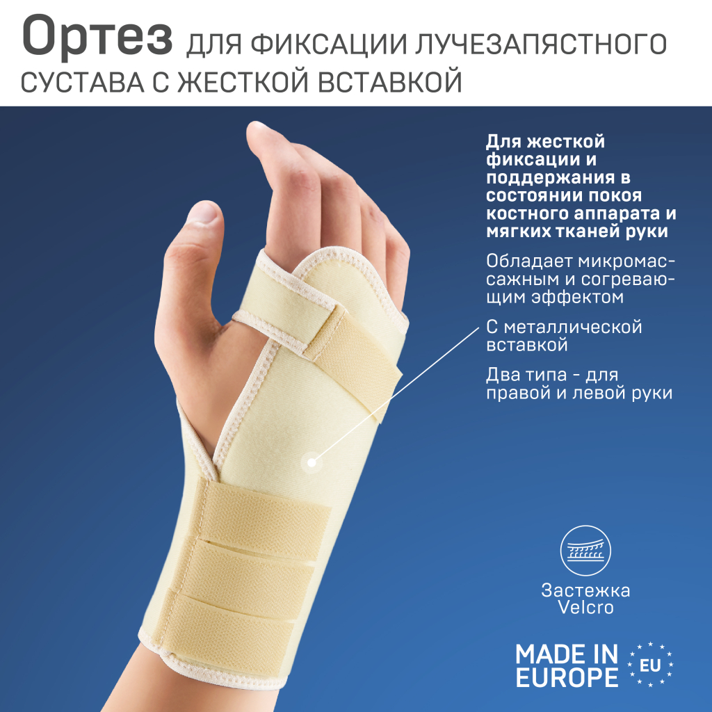 Ортез (тутор) для фиксации лучезапястного сустава с жесткой вставкой предназначен для надежной стабилизации и поддержания покоя связочного аппарата и мягких тканей руки. Он обеспечивает стабилизирующее, микромассажное и тепловое воздействие.