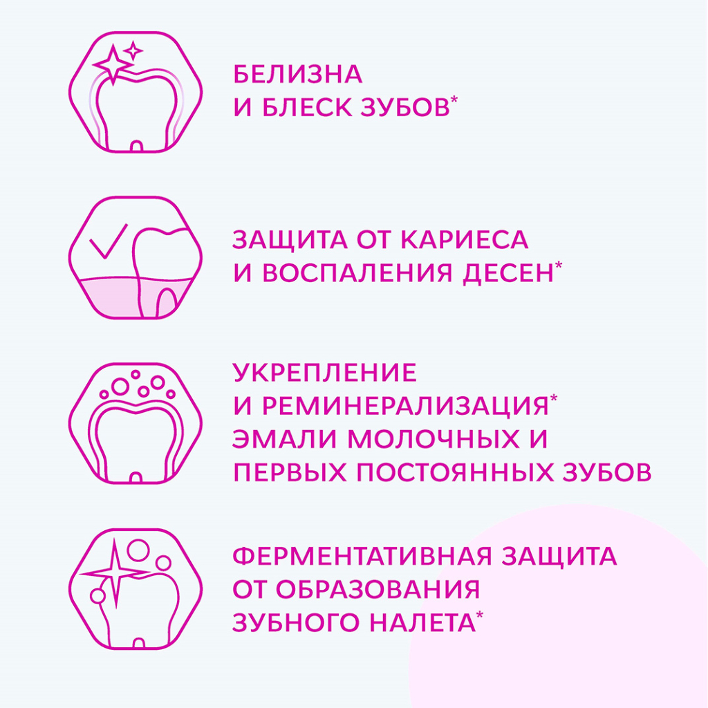 - Приятный вкус: мягкий, не слишком сладкий вкус поощряет детей чистить зубы.