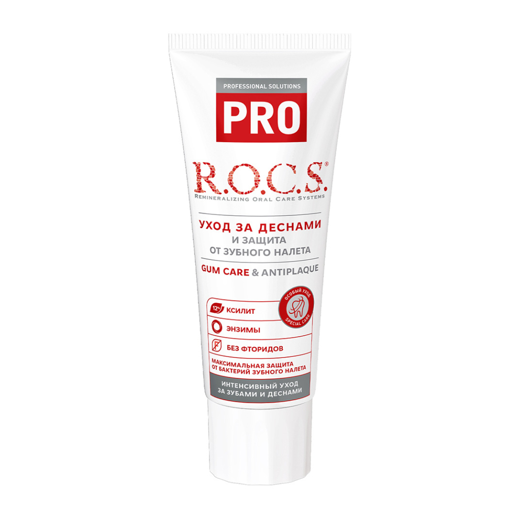 Зубная паста R.O.C.S. Pro Gum Care & Antiplaque разработана для уменьшения риска возникновения заболеваний полости рта, связанных с образованием зубного налета. Ее уникальная формула замедляет образование зубного налета, улучшает состояние десен, уменьшает кровоточивость, защищает от бактерий, укрепляет эмаль и эффективно борется с кариесом. Эта зубная паста обеспечивает долговременное чувство свежести и чистоты в течение всего дня.