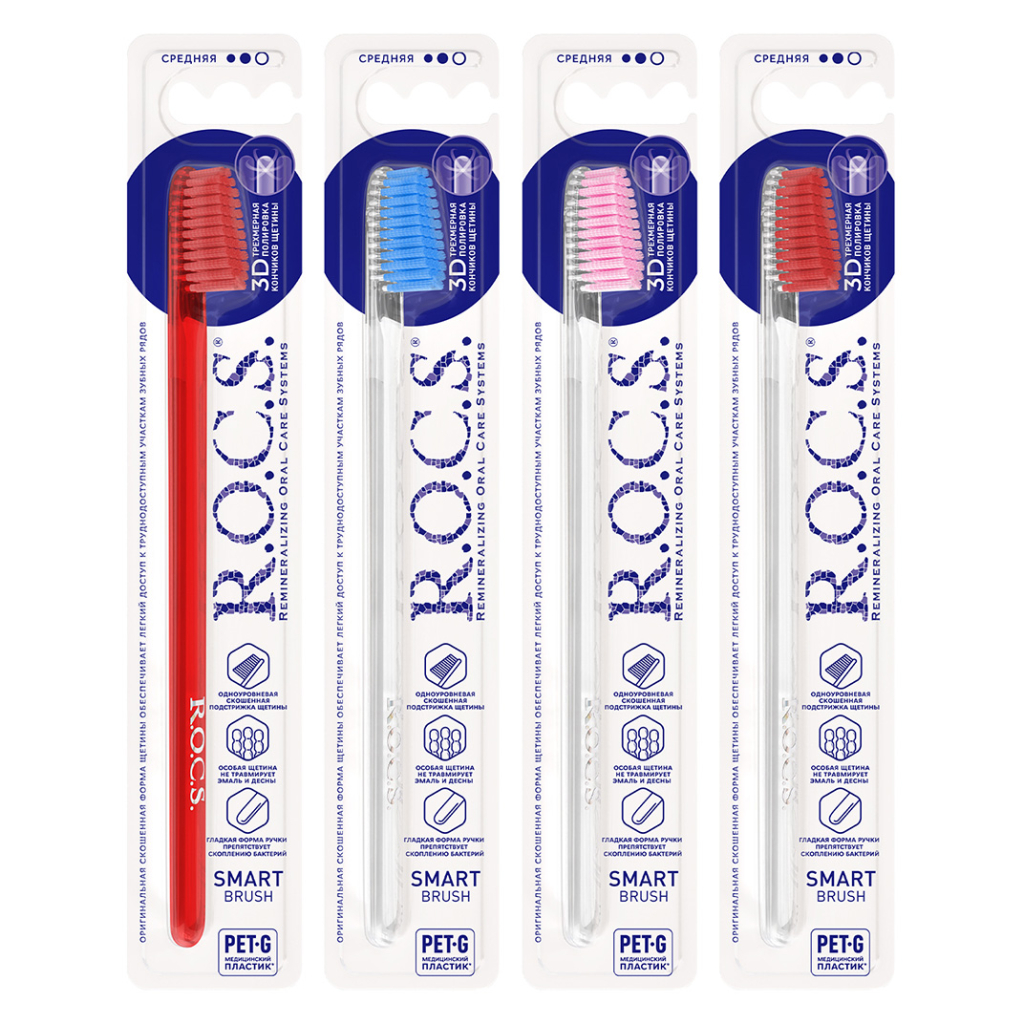 Зубная щетка ROCS Smart brush классическая со щетиной средней степени жесткости разработана для эффективного ухода за полостью рта. Щетина имеет текстурированную структуру и скошенную форму, что улучшает качество очистки зубов и обеспечивает доступ в сложные участки зубного ряда. Кончики щетинок закруглены и отполированы — это исключает повреждение эмали, реставраций и мягких тканей десны. Тонкая плоская ручка из безопасного пластика снижает избыточное давление во время чистки и способствует правильному выполнению техники.