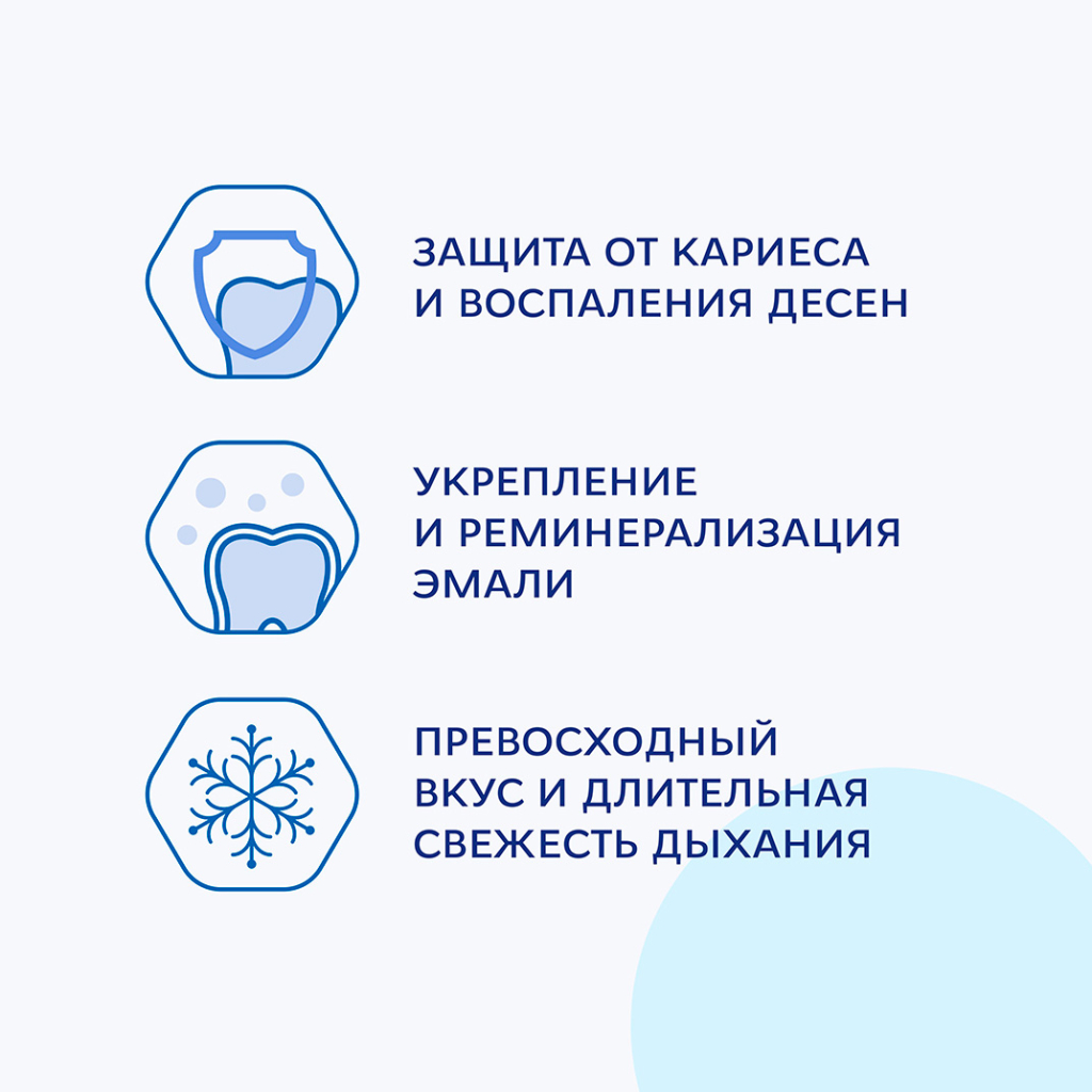 - Ксилит (6%) способствует реминерализации эмали, защищает от кариесогенных бактерий и поддерживает здоровый баланс микрофлоры.