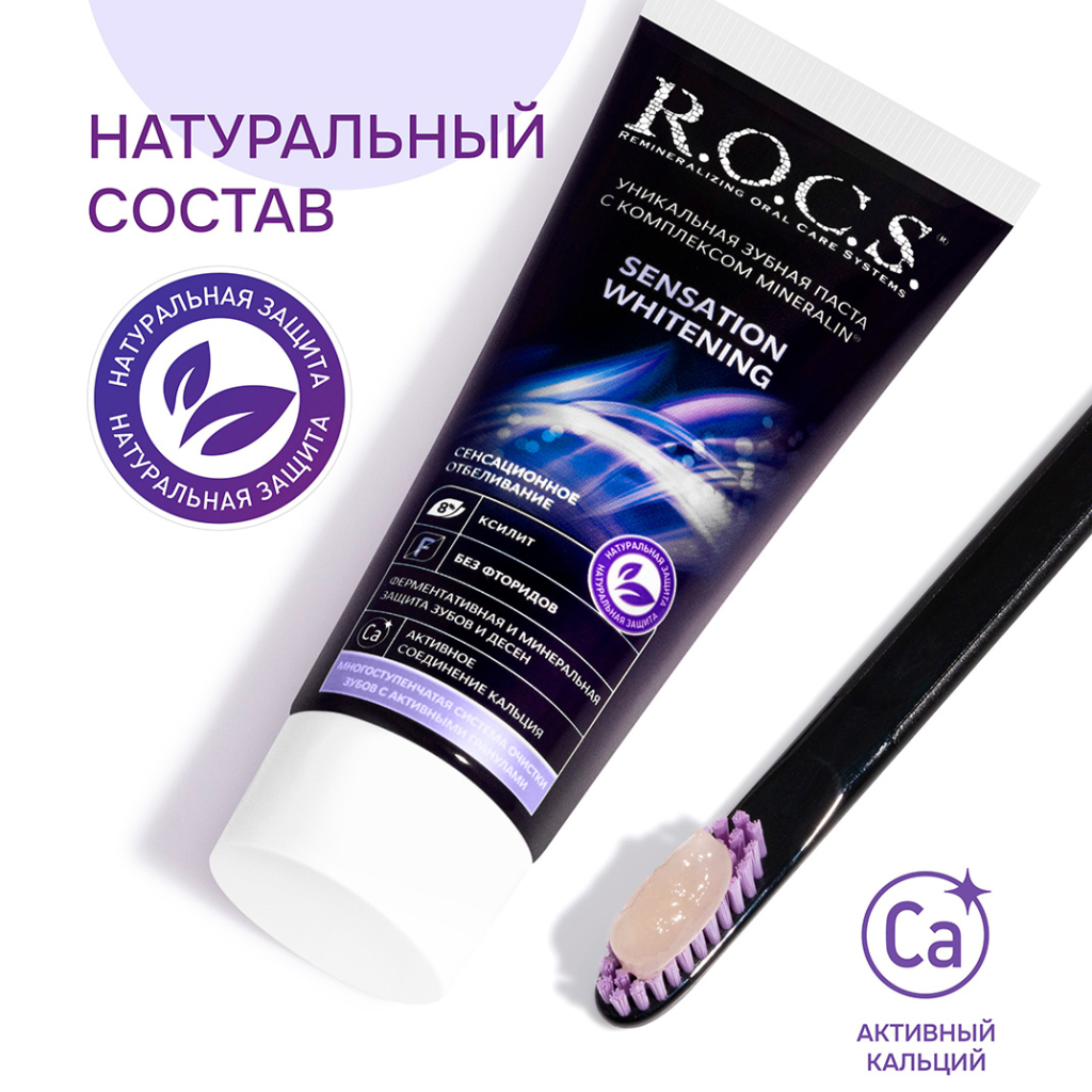 Научная Лаборатория WDS представляет уникальную зубную пасту R.O.C.S. Сенсационное отбеливание, которая позволяет эффективно бороться с поверхностными окрашиваниями, возвращает эмали здоровье и блеск, помогает предотвратить образование налета и пигментаций. Уникальная формула зубной пасты выполнена на основе новейшей многоступенчатой очищающей системы, содержащей специальные очищающие полирующие гранулы. Благодаря особой структуре гранулы на начальном этапе чистки зубов качественно, быстро и безопасно удаляют мягкий зубной налет.