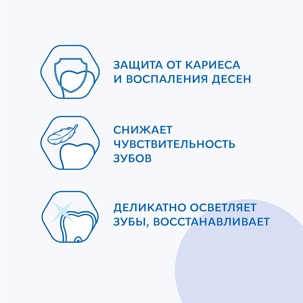 Неабразивная зубная паста (RDA=40) для быстрого устранения повышенной чувствительности зубов. Разноразмерные частицы гидроксиапатита, имеющие высокое сродство к тканям зуба, обеспечивают быстрое снижение чувствительности* путем запечатывания мельчайших дефектов эмали и канальцев обнаженного дентина.