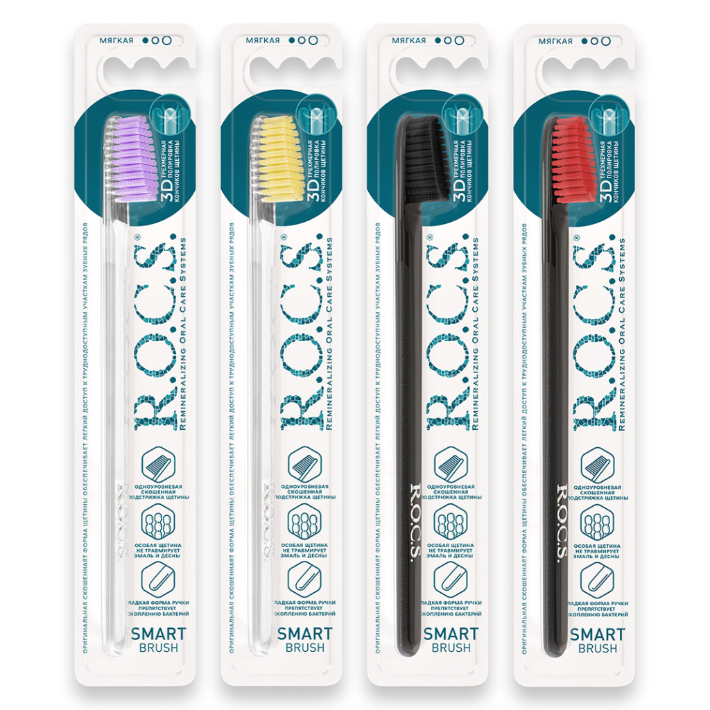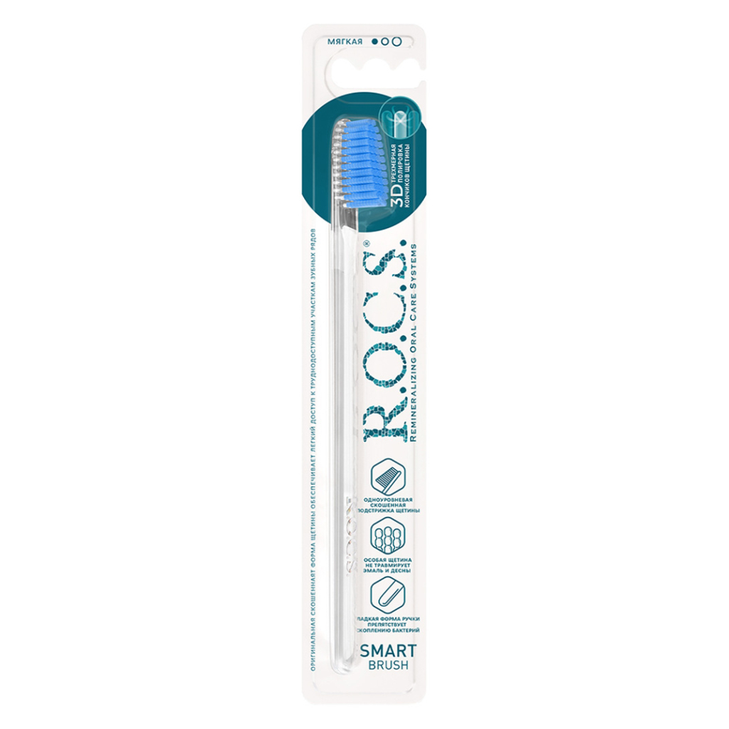 Зубная щетка ROCS Smart brush классическая с мягкой щетиной разработана для эффективного и бережного ухода за полостью рта. Щетина имеет текстурированную структуру и скошенную форму, что улучшает качество очистки зубов и обеспечивает доступ в сложные участки зубного ряда. Кончики щетинок закруглены и отполированы — это исключает повреждение эмали, реставраций и мягких тканей десны. Тонкая плоская ручка из безопасного пластика снижает избыточное давление во время чистки и способствует правильному выполнению техники.