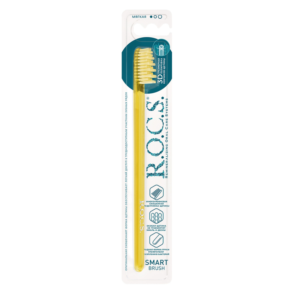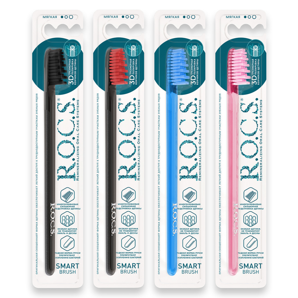 Зубная щетка R.O.C.S. Smart brush модельная с мягкой щетиной создана для деликатного и результативного ухода за зубами и дёснами. Щётка доступна в различных цветовых вариантах — чтобы получить определённый цвет, укажите это в комментарии при оформлении заказа.
