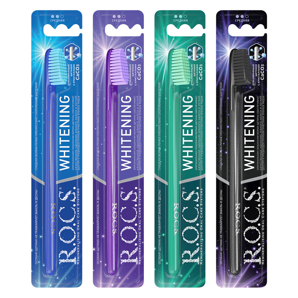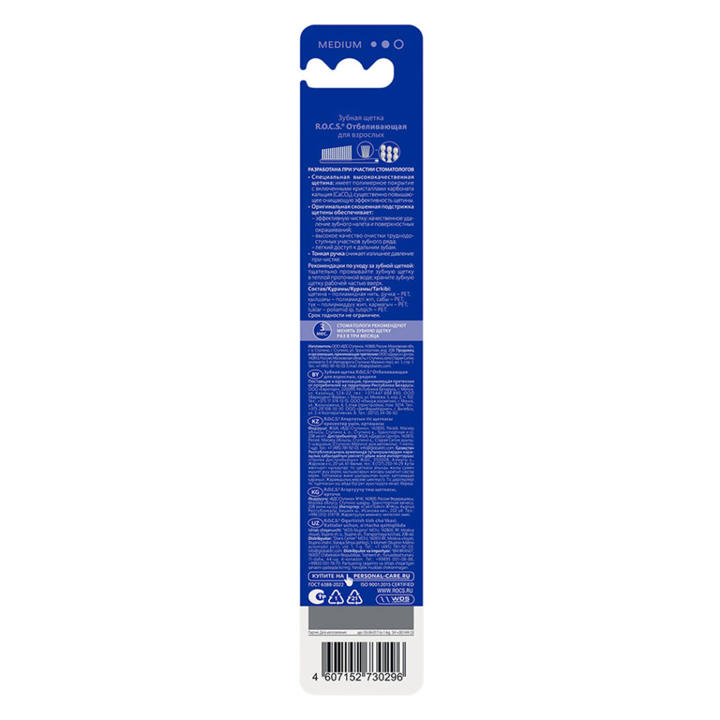 Зубная щетка R.O.C.S. Отбеливающая средней жесткости — надёжный помощник для домашнего отбеливания зубов. Щетина с полимерным покрытием содержит кристаллы карбоната кальция (CaCO₃), которые обеспечивают дополнительный абразивный эффект для более активного удаления окрашенного налёта.